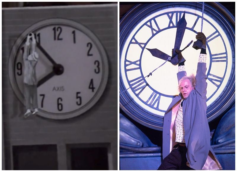 At the one-minute mark, the first and most sneaky instance of foreshadowing has occurred. You can see a small man hanging off the hands of one of the clocks: a reference to the same predicament that Doc will find himself in at the climax of the movie at the clocktower. Clever and nested foreshadowing is absolutely vital to what makes BTTF work, and so we’re going to note every instance of it from here on out.
