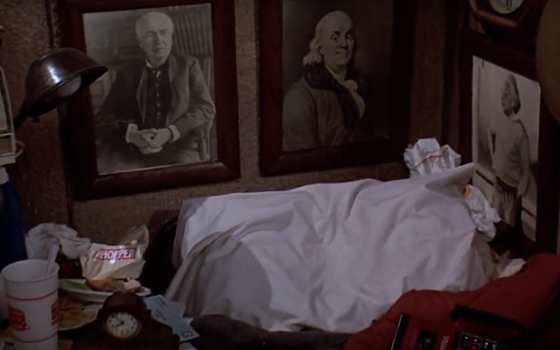 We pan down from the clippings to a series of portraits of famous scientists – Isaac Newton, Albert Einstein, Benjamin Franklin, and Thomas Edison – and a dank and squalid mattress, with a lot of junk food and trash strewn around it.