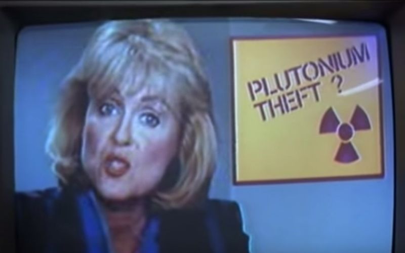We pan further left: the hand of one clock turns a TV on automatically, and the news anchor mentions three things: plutonium has gone missing from a local nuclear plant, officials are denying that it’s been stolen, and Libyan terrorists are involved somehow.