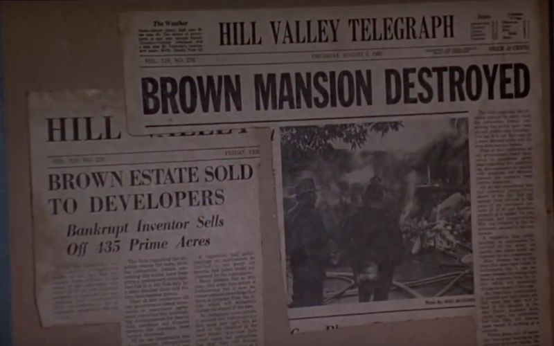 By 1.15 we’ve panned over to two newspaper clippings: one that says that a ‘Brown Estate’ has been sold to real estate developers, and another saying that the house has burned down. This is a reference to a line of Doc’s at the Mall (“It’s taken 30 years and my entire family fortune to fulfil the vision of that day”) but it also gives us a setting with the ‘Hill Valley Telegraph’ newspapers.
