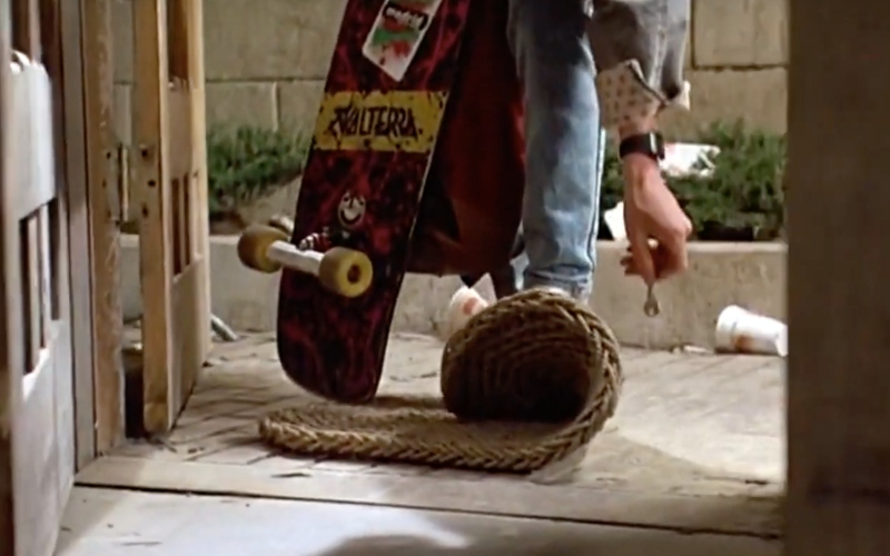 We have a big pay off now: the skateboard rolls forward and slides under a table, to rest against a yellow case with warning signs for radioactive material. We’ve just added two guns to Chekov’s arsenal: the skateboard (Marty will use an improvised one to escape Biff’s car) and the plutonium, (which will be used to send Marty back to 1955). But more important than that, the audience has been given its first reveal: Doc Brown, the owner of this house, who is obsessed with clocks, makes bad inventions, loves his dog, and is friends with a teenager, was the one who stole the plutonium.