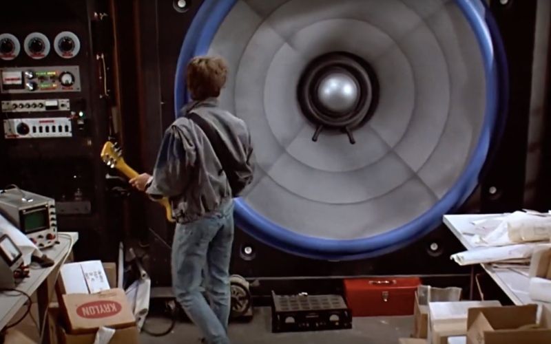 Then there’s a joke from Doc about the amp (“There’s a slight possibility of overload”) and all the clocks’ alarms go off at once. Doc cheers because his ‘experiment’ apparently worked, and all the clocks are 25 minutes slow. Marty panics, realises he’s late for school. Huey Lewis plays: the movie has begun.