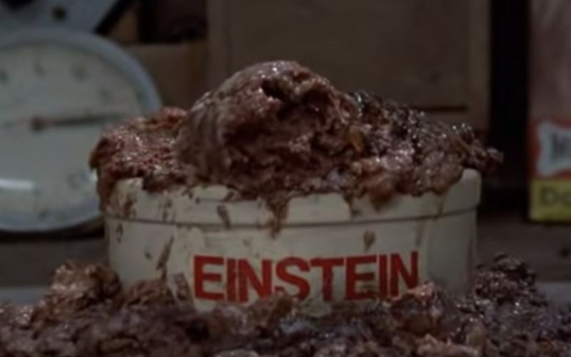 Next we pan left to a shot of a complex-looking Rube-Goldberg-like device, which opens a can and then slops a dollop of dog food into a dog’s bowl. We see the dog’s name is ‘Einstein’ (more foreshadowing, as we meet him later and Einstein is vitally important for explaining to the audience how the Delorean works and why Marty shows up in this scene at all) which suggests that whoever lives here is nice enough to own a pet, and clearly has a sense of humour. The inhabitant of this house is eccentric: not insane.