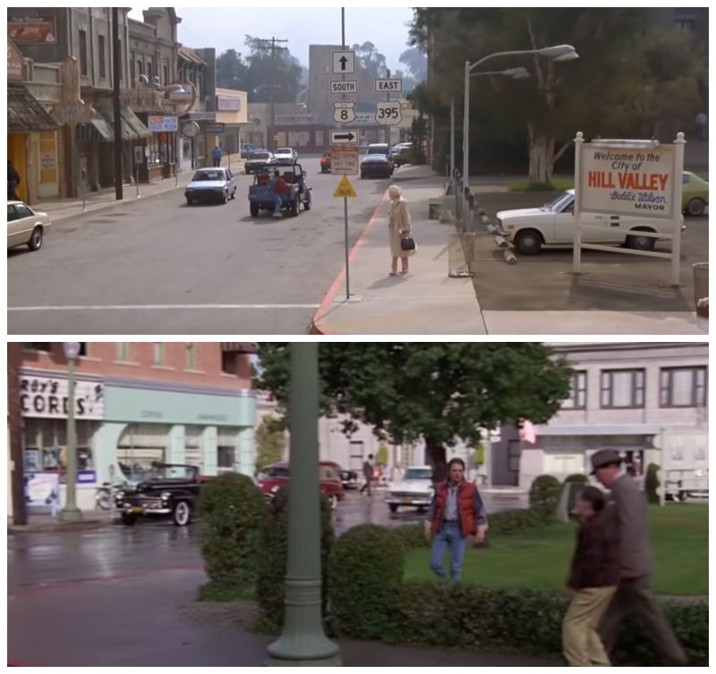 Marty travelling to school looks like a cheesy montage that’s just jolting the audience awake with some pop music. But look closely when Marty is journeying through town; almost all the shots of the main town square are going to be replicated for the sake of contrast later on, when Marty first arrives in 1955.