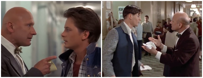 Jennifer tries to cover Marty’s ass, and re-emphasises his character trait of chronic lateness (he’s gotten four tardies in a row over the last week) and the Principal Strickland appears and sets up another gag format that BTTF loves: mirrored dialogue.