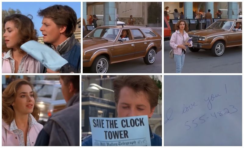 What happens next is so deft and quick that it’s almost like a magic trick. Watch the sleight of hand: Marty gives the stranger some spare change, to make this tiresome distraction leave him be, and then the Clocktower Lady insists he takes a flyer. Marty does so, and goes back to kiss Jennifer, but Jennifer’s dad arrives and she has to leave. Marty says he’ll call her, and she says she’s staying at her grandmother’s that night. She takes that all-important flyer from Marty writes her granny’s number (and “I love you”) on the flyer, gives it to Marty and leaves.