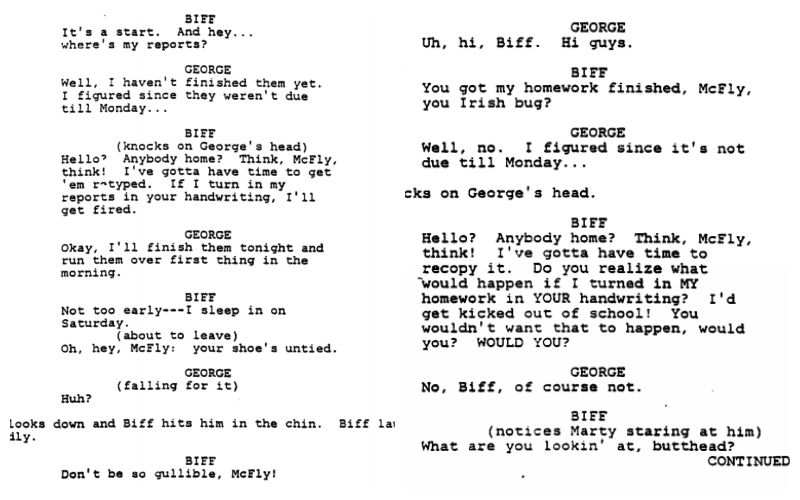 We also get the most blatant example of mirrored dialogue: Biff berating George for not finishing his report, is almost word-for-word identical to what his teenage self says to George in the diner about his homework. It even ends with Biff saying “What are you looking at butthead?” to Marty. Check out out: