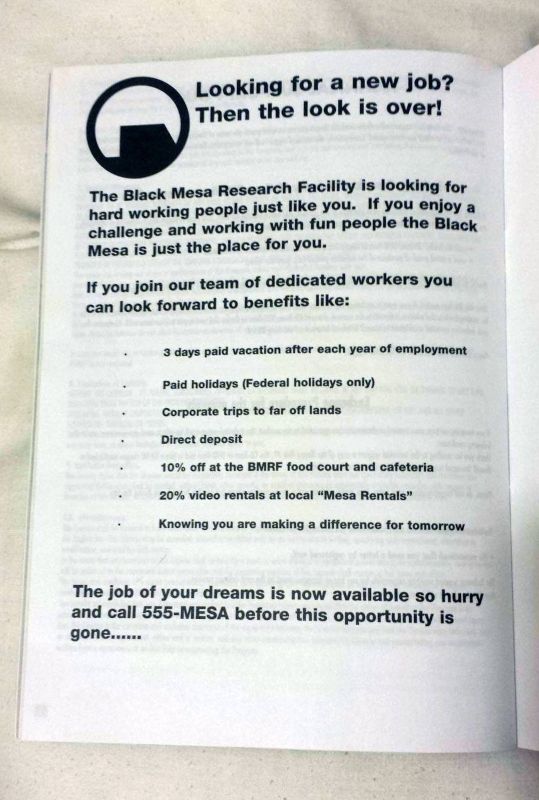 “Looking for a new job? Then the look is over! The Black Mesa Research Facility is looking for people just like you. If you enjoy a challenge and enjoy working with fun people, then Black Mesa is just the place for you.”